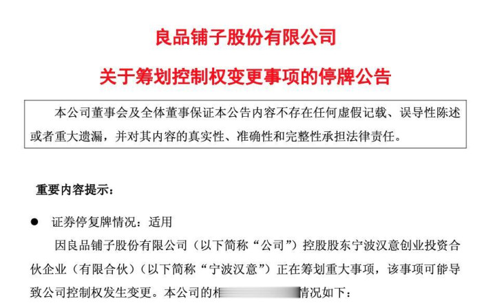 据南都此前报道,2025年7月10日晚,良品铺子发布公告称,其收到公司控股股东宁波汉意创业投资合伙企业(有限合伙)(即“宁波汉意”)通知,宁波汉意正在筹划重大事项,该事项可能导致良品铺子控制权发生变更。